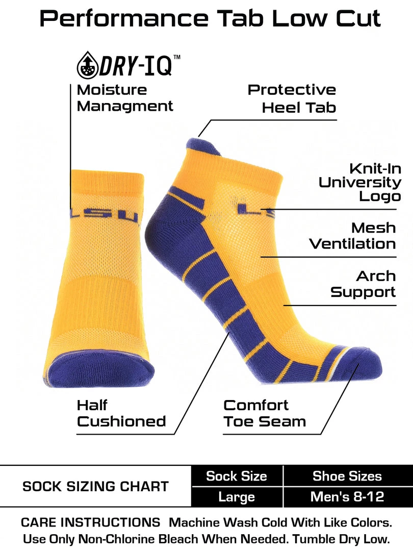 TCK No Show Performance Low Cut Socks are the perfect athletic ankle sock. Wear these to the tailgate party, working out, or lounge around the house.Offering comfort, breathability, performance, and durability these high quality Louisana State University Tigers socks are an ideal gift for Father’s Day, birthdays, stocking stuffers or going back to school. Made of 97% Polyester, 3% Spandex. Gear up for the big game! Go Tigers!