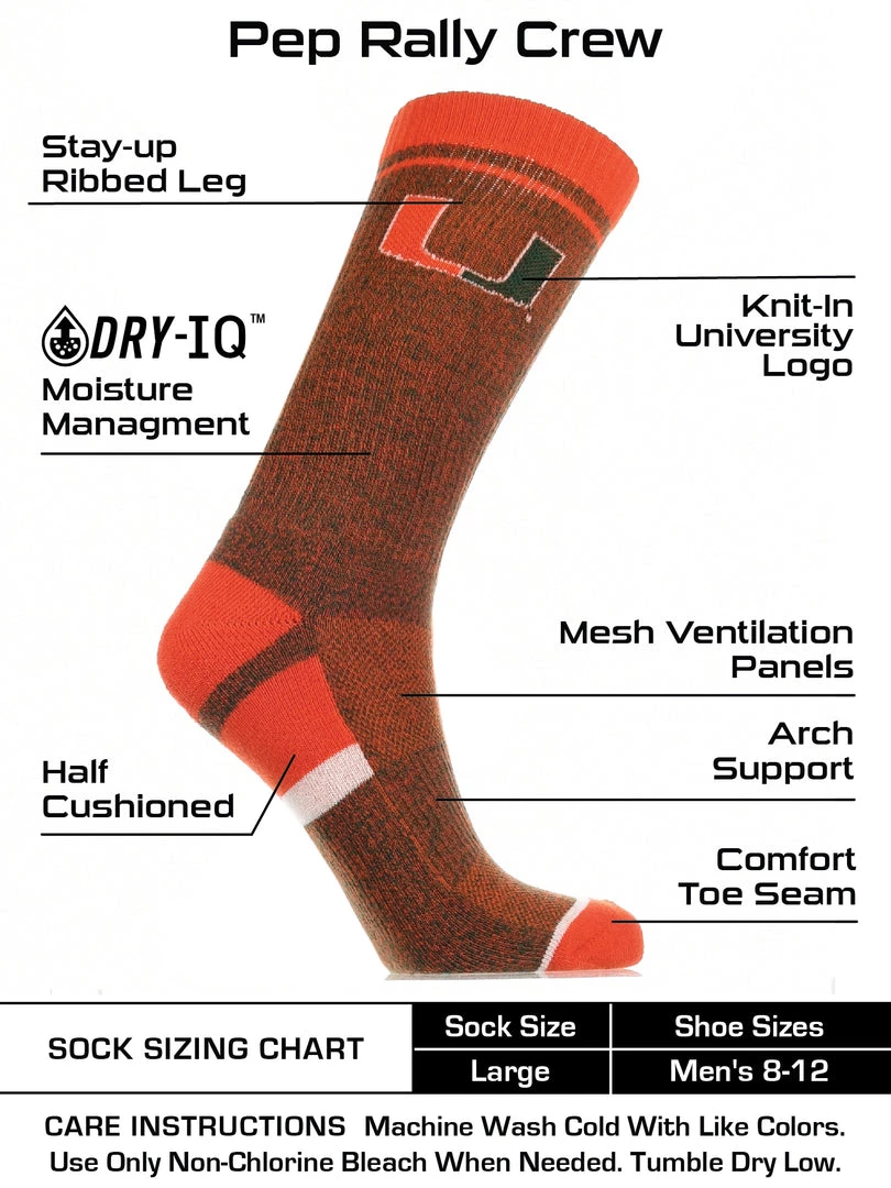 - COMFORT AND BREATHABILITY: These premium quality Miami Hurricanes socks provide soft comfort. Mesh panel ventillation above the foot allows for proper air flow. Keeping the feet dry. Moisture management technology pulls away moisture from skin.