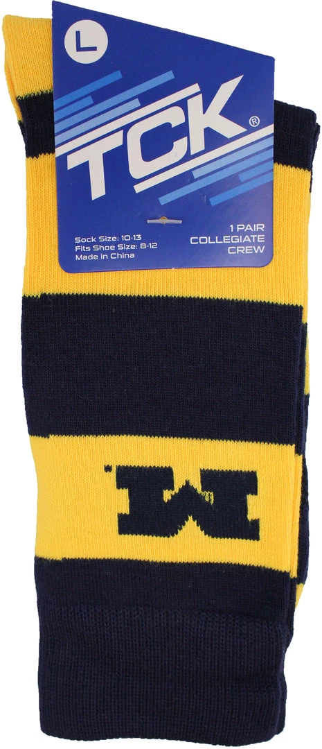 Show your school spirit in the office, at a wedding, at the football stadium or basketball game. Soft and durable, these socks let you maintain a professional look while you support your school. Offering comfort, breathability, performance, and durability these high quality University of Michigan Wolverines socks are an ideal gift for Father’s Day, birthdays, stocking stuffers or going back to school. TCK Game Day Striped Socks are made up of 97% Polyester, 3% Spandex. Go Blue!