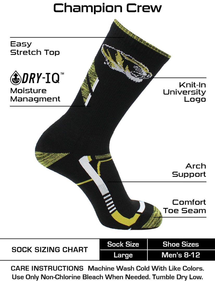 Wear your loud and proud school pride on your feet and be ready for even the most strenuous activities. Perfect with sneakers and slides, these socks let you be athletic ready while you support your school. Offering comfort, breathability, performance, and durability these high quality University of Missouri Tigers socks are an ideal gift for Father’s Day, birthdays, stocking stuffers or going back to school. Made of 94% Polyester, 4% Rubber, 2% Spandex. Go Tigers!