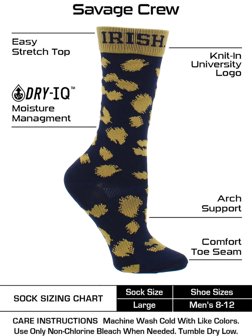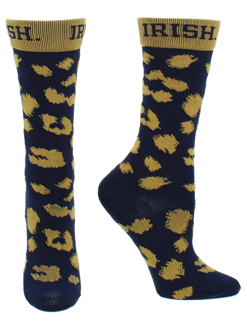 - COMFORT AND BREATHABILITY: These premium quality Notre Dame Fighting Irish leopard print casual socks provide soft comfort. Moisture management technology pulls moisture and sweat away from skin.