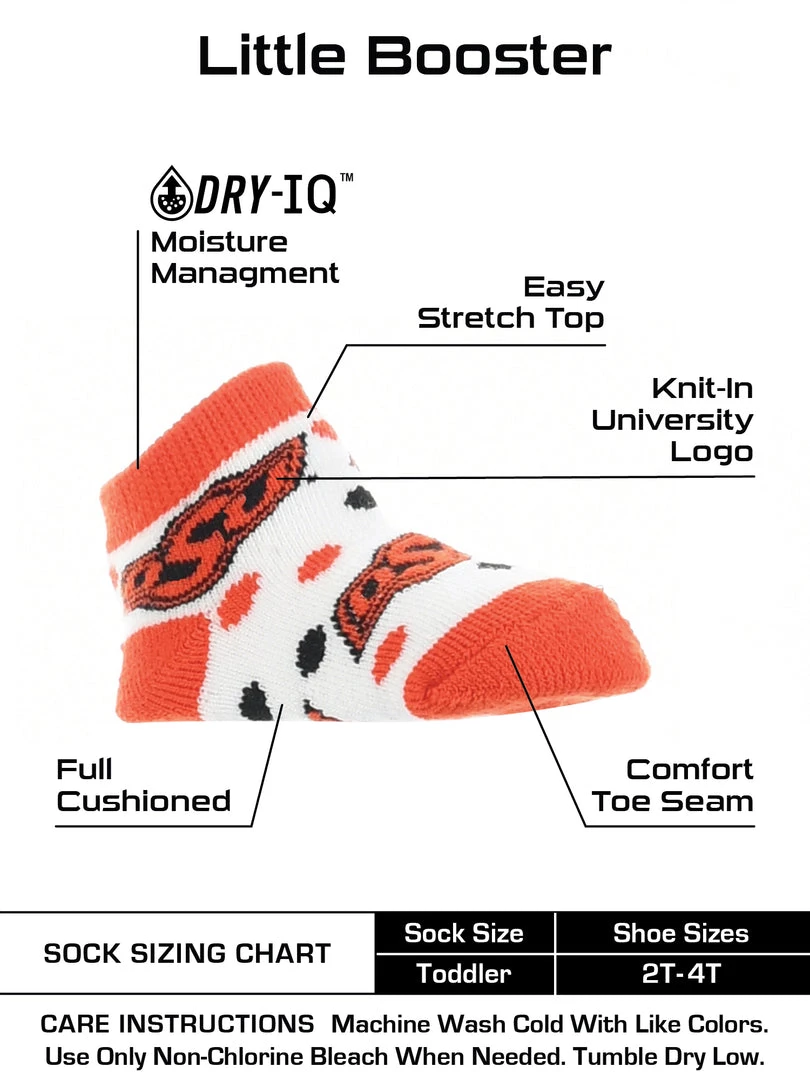 TCK Little Fan Low Cut Toddler Socks are soft and comfy. Get the little ones ready for gameday. If you are headed to the tailgate, game or cheering on the team from home, show off the school spirit! Offering an easy stretch top, soft comfortbale feel, and durability these high quality Oklahoma State Cowboys socks are an ideal gift for birthdays, stocking stuffers or baby showers. Toddler Size 2T-4T. Made of 98% Polyester, 2% Spandex. Go Pokes!
