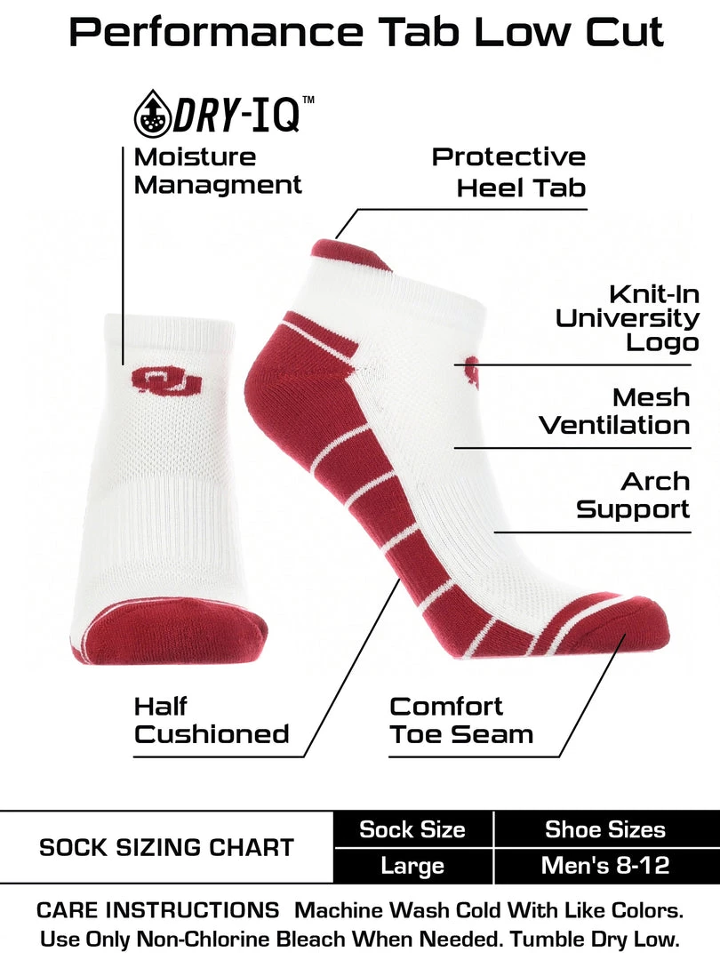 TCK No Show Performance Low Cut Socks are the perfect athletic ankle sock. Wear these to the tailgate party, working out, or lounge around the house.Offering comfort, breathability, performance, and durability these high quality Oklahoma University Sooner socks are an ideal gift for Father’s Day, birthdays, stocking stuffers or going back to school. Made of 97% Polyester, 3% Spandex. Gear up for the big game! Boomer Sooner!