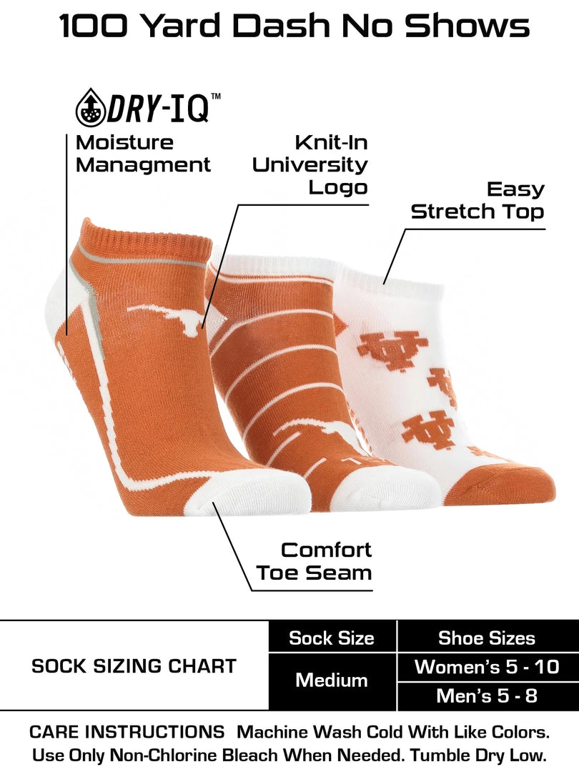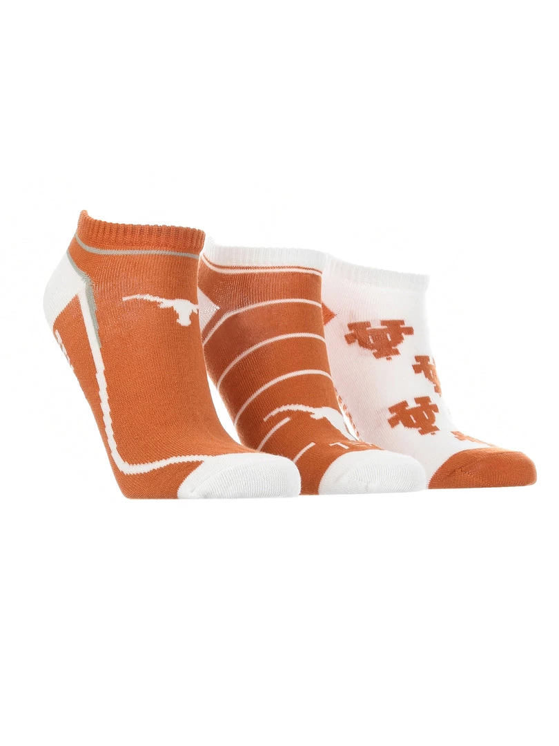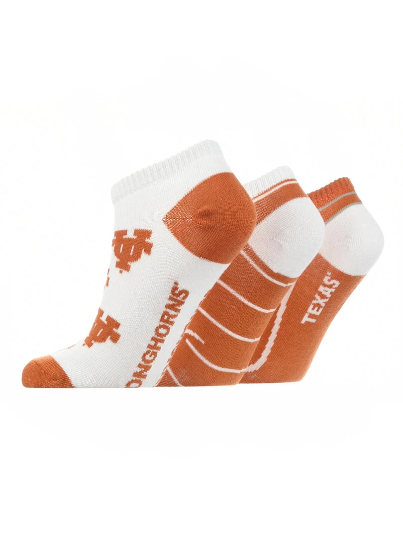 TCK Full Field, No Show Socks come with 3 pairs of comfy socks. Get ready to cheer on your favorite team during the season! Wear these to the tailgate party, working out, or lounge around the house.Offering comfort, breathability, and durability these high quality University of Texas Longhorns socks are an ideal gift for birthdays, stocking stuffers or going back to school. Made of 97% Polyester, 3% Spandex. Gear up for the big game! Hook Em Horns!