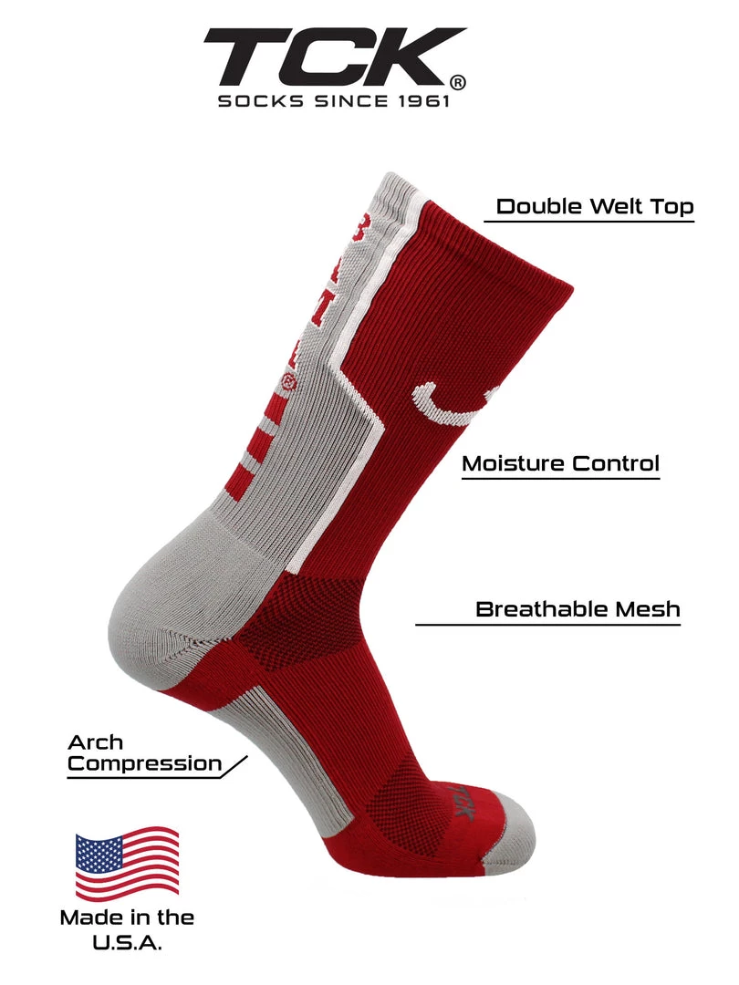 - COMFORT AND BREATHABILITY: These premium quality Alabama Socks provide soft comfort. Mesh panel ventillation above the foot allows for proper air flow. Keeping the feet dry. Moisture management technology pulls away moisture from skin.