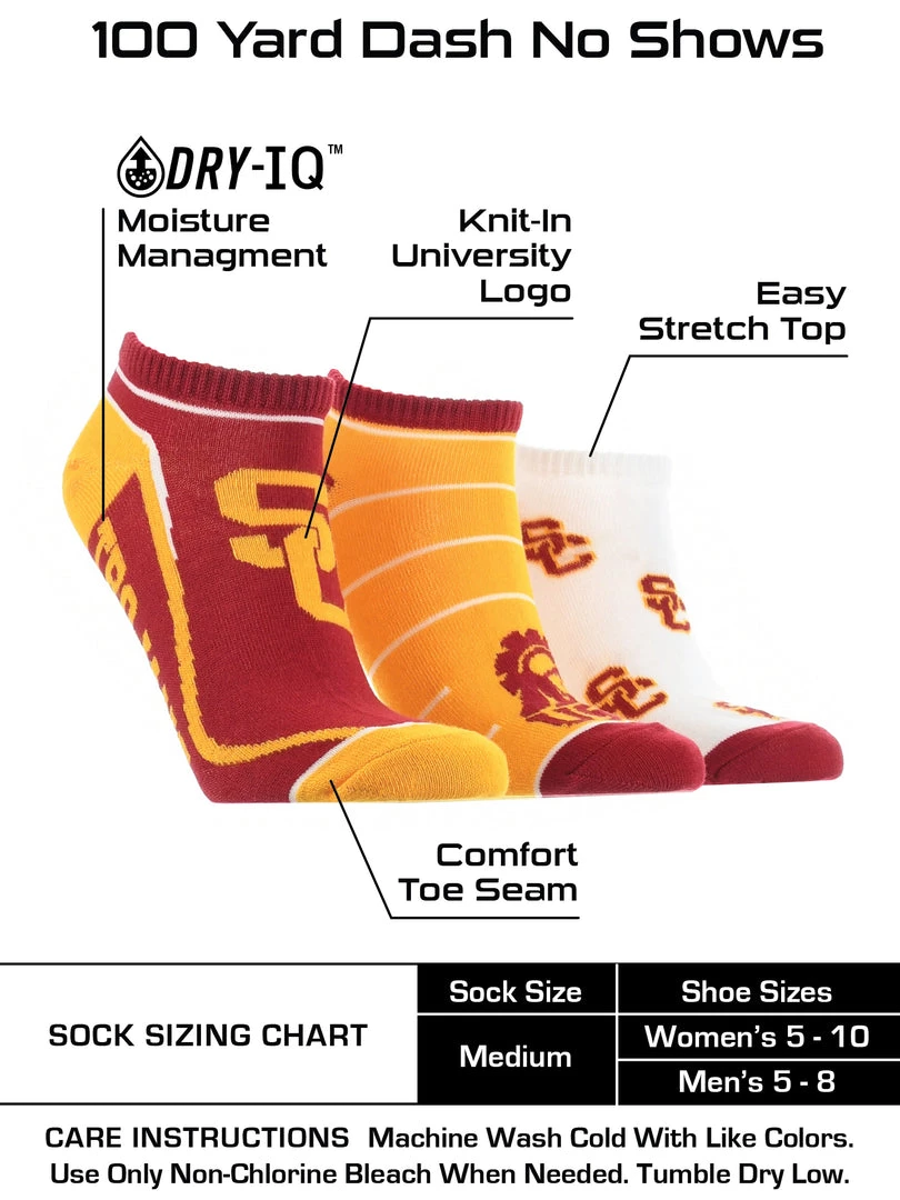 TCK Full Field, No Show Socks come with 3 pairs of comfy socks. Get ready to cheer on your favorite team during the season! Wear these to the tailgate party, working out, or lounge around the house.Offering comfort, breathability, and durability these high quality USC Trojans socks are an ideal gift for birthdays, stocking stuffers or going back to school. Made of 97% Polyester, 3% Spandex. Gear up for the big game! Fight On!