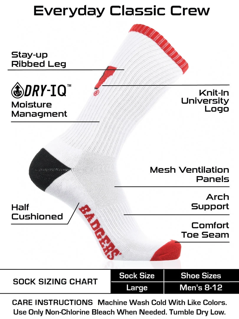 The Basic Crew White Socks offer timeless design, superior comfort all while showing your school pride. Perfect with sneakers and slides or even lace-ups and loafers, these socks bring versatility to your wardrobe no matter what the occasion. These high quality University of Wisconsin Badgers socks are an ideal gift for Father’s Day, birthdays, stocking stuffers or going back to school. TCK Basic Crew White Socks are made up of 94% Polyester, 4% Rubber, 2% Spandex. Go Badgers!