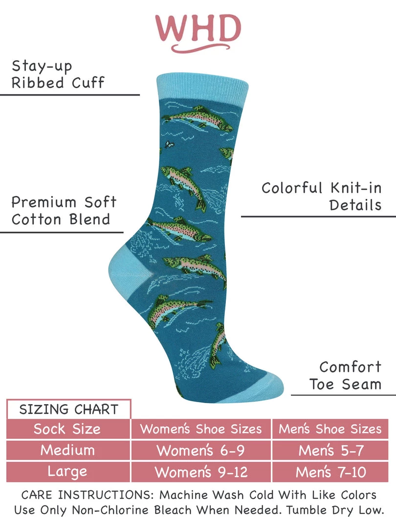 - PERFECT FOR ANGLERS – Go fishing and catch lots of Trout with these crew socks from Wheel House Designs. Consider these your good luck charm. Whether you actually catch any or not, these are the perfect gift for the angler in your life.